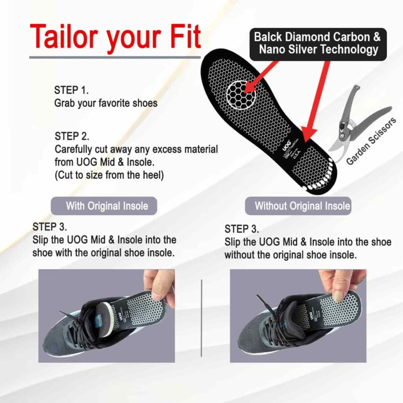기존 신발 깔창을 사용하거나 사용하지 않고 UOG 미드 및 깔창을 신발에 넣습니다.